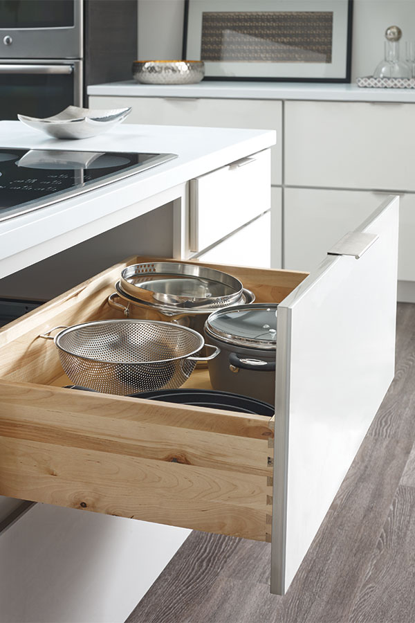 The two deep drawers in our Two Drawer Base Cabinet are perfect for pots, pans or any taller items, and are easily accessible with one motion movement, and the scooped drawer eliminates any issues with installation directly under a cooktop.